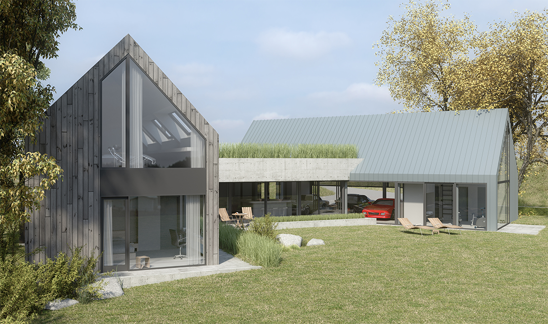 We united all restraining factors in the reduction of the house to its bare essentials paying homage to case-study homes of the 50’s and the than favored steel skeleton structure; developing farm-type concept for it allowed to separated functional prerequisites, allow for simple structural elements, emulate its environment and interpret in a modern and whimsical way typical for this area barn-structures and materials. In addition we forwent to use a fence saving cost and underlining the ambition to blend into the landscape.