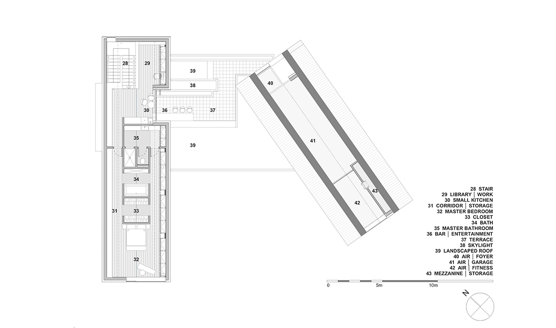 The hierarchy of the rooms is determined by ceiling height despite its uniformity height of just 2,80m. The living room floor is lowered with 45 cm in comparison to foundation level achieving grand height, where as the party and cars show room have full height of nearly 6 meters.